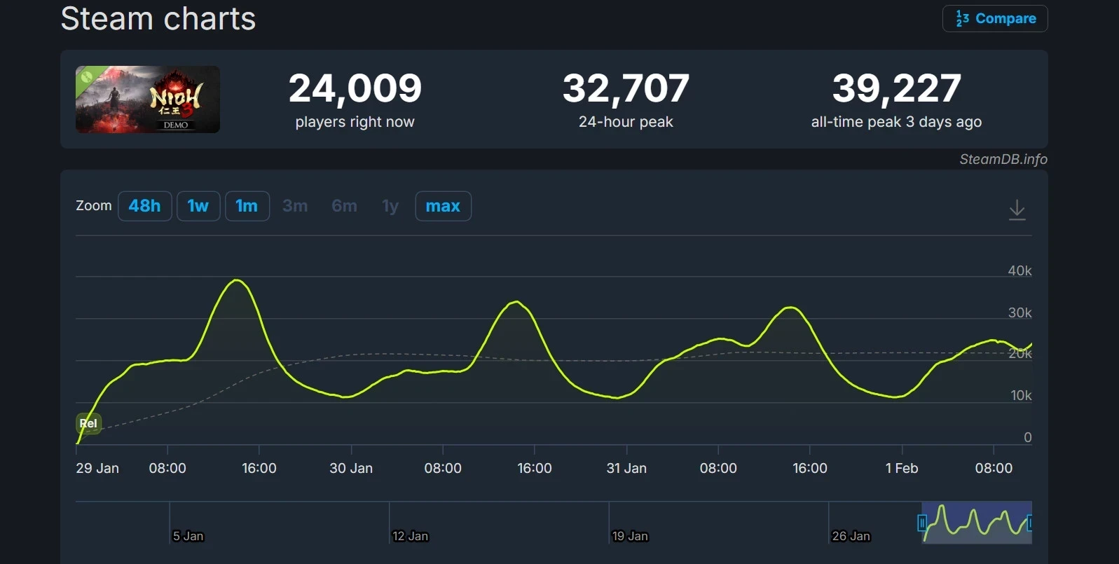 Бесплатная демоверсия показала достойный результат и смогла обогнать по пиковому онлайну даже полное издание первой Nioh — в оригинале находилось лишь 10,6 тыс. человек на пике онлайна в Steam. А вот до показателей второй части «демка» Nioh 3 слегка не дотягивает — в своё время Nioh 2 привлекла более 41 тысячи единовременных игроков.