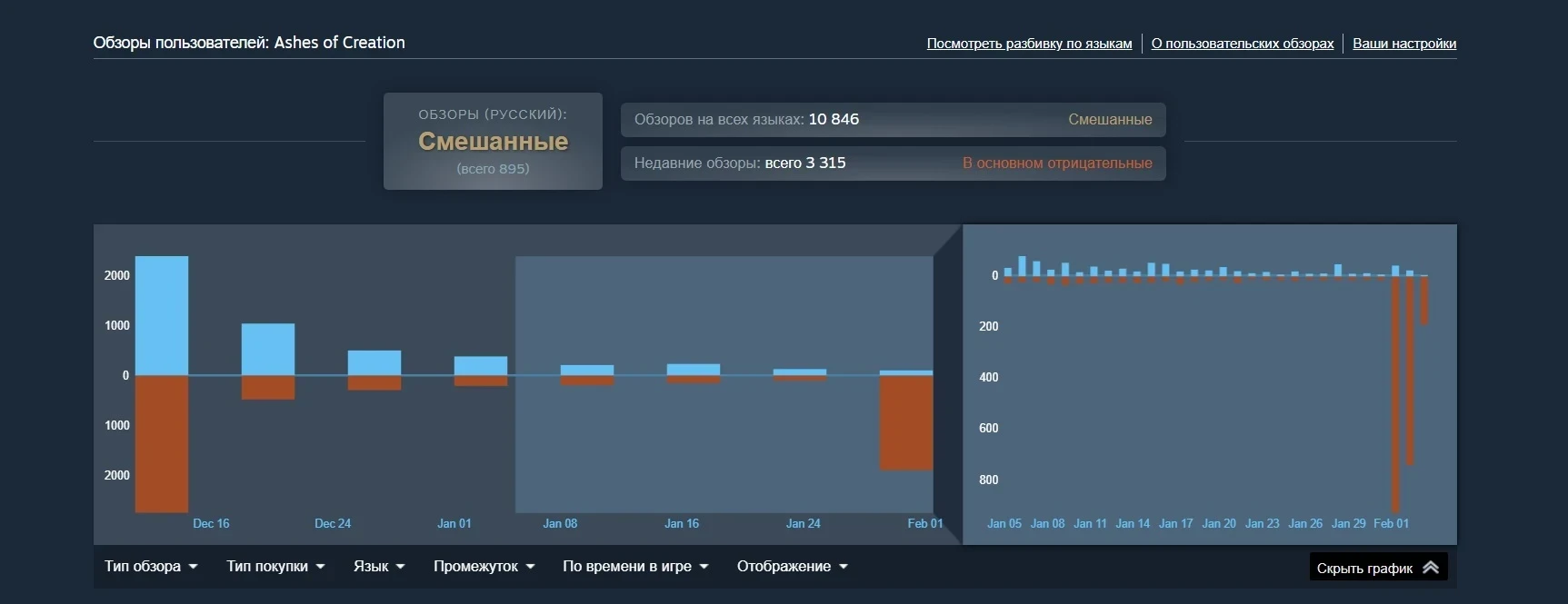 «Ревью-бомбинг» Ashes of Creation в Steam продолжается с 1 февраля. Её общий рейтинг опустился до «смешанного»: 45% одобрения из более 16 тыс обзоров. Пользователи обвиняют Intrepid Studios в скаме и требуют вернуть всем деньги.
