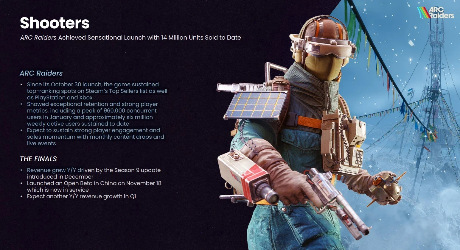 Также себя хорошо показала The Finals — предыдущая игра авторов ARC Raiders из Embark Studios. Благодаря девятому сезону выручка шутера в четвёртом квартале выросла в сравнении с аналогичным периодом 2024 года.