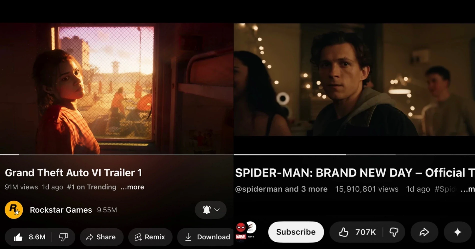 - Grand Theft Auto VI: 91 млн просмотров и 8,6 млн лайков.
