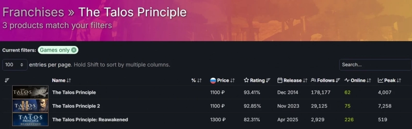 1 фотоМестный пиковый онлайн The Talos Principle: Reawakened вышел скромным — 519 игроков одновременно. Оригинал в своё время привлёк более 4 тыс игроков одновременно.