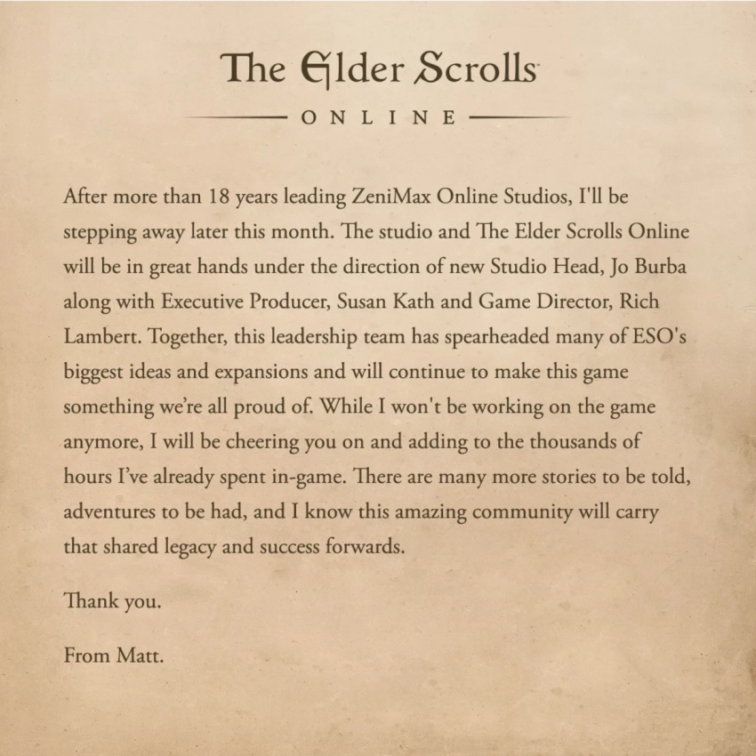 Параллельно стало известно об уходе президента ZeniMax Online Studios Мэтта Файрора — он покинет студию в конце месяца после 18 лет работы. Его место займёт Джо Бёрба.