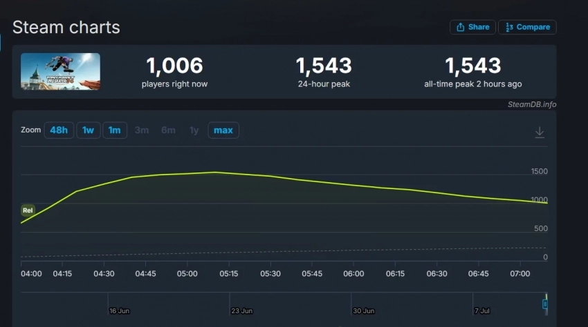 В Steam пиковый онлайн Tony Hawkʼs Pro Skater 3+4 за первые часы после релиза достиг 1 543 игроков одновременно.