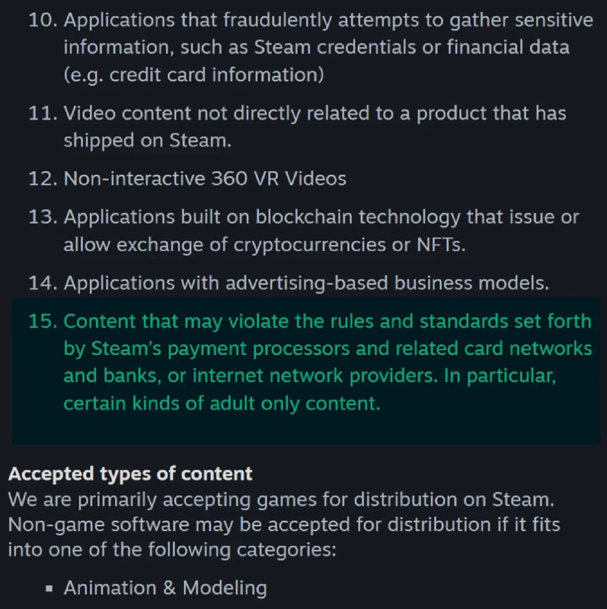 «Запрещён контент, который может нарушать правила и стандарты, установленные платежными системами Steam и связанными с ними сетями [банковских] карт и банками, а также интернет-провайдерами. В частности, некоторые виды контента только для взрослых», — новое ограничение Steam.