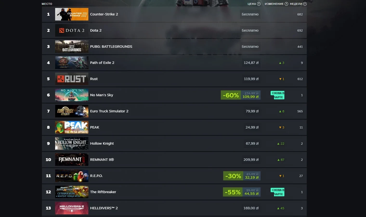 Что касается российского региона, то лидирующие позиции занимает ряд условно-бесплатных игр. Лишь на четвёртой строчке расположилась Path of Exile 2, которая сумела обогнать выживалку Rust. Упомянутая выше No Man’s Sky смогла вернуться в чарт на шестое место, тогда как метроидвания Hollow Knight поднялась на 22 позиции вплоть до девятой строчки — игроки хотят пройти первую часть перед релизом сиквела.