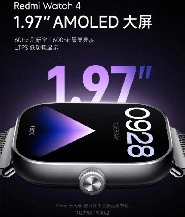 Компания Xiaomi сообщила, что Redmi Watch 4 будут оснащены 1,97-дюймовым LTPS AMOLED-дисплеем с частотой обновления 60 Гц и пиковой яркостью 600 кд/м2.