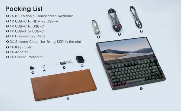 Kwumsy K3 также поставляется с адаптером питания USB-C и несколькими адаптерными кабелями, включая USB-C-HDMI, USB-C-USB-C и USB-A -USB-C.
