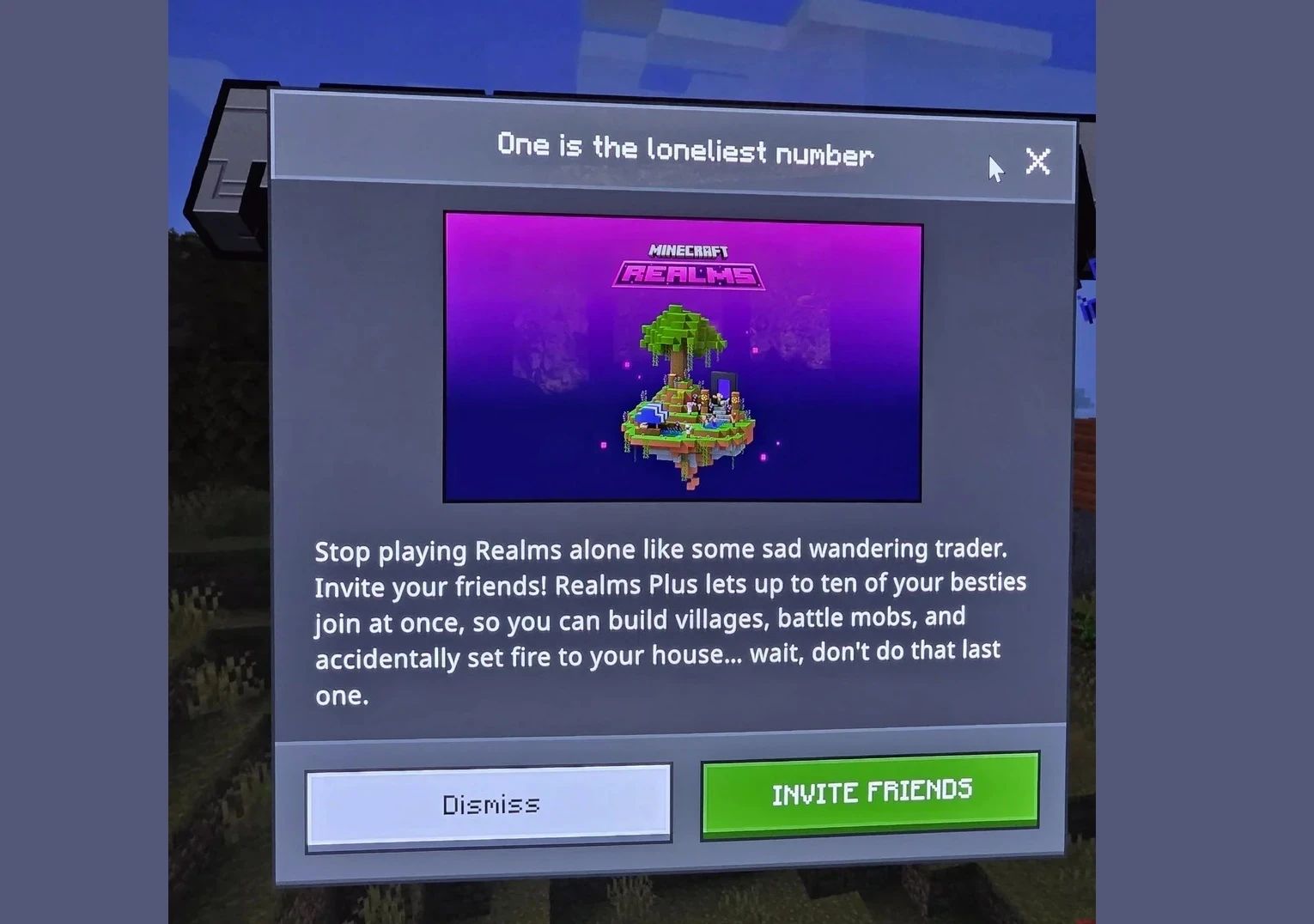 Иногда во время игры геймеры получали сообщение, озаглавленное: «Единица — самое одинокое число». Далее следовал текст, призывающий не быть «как какой-то грустный странствующий торговец», а пригласить друзей на свой сервер. Естественно, для этого нужна подписка Plus.