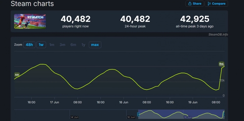 Говорить об успехах Rematch пока рано. В момент написания новости пиковый онлайн в Steam составил 40 тысяч человек — меньше, чем было в момент выхода в расширенном доступе или в рамках бета-тестирования. Однако число единовременных игроков наверняка растит в ближайшие часы или на выходных — в рамках бесплатных тестов новинкой заинтересовалось почти два миллиона человек.